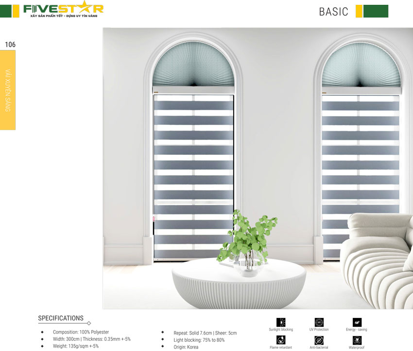 Rèm cầu vồng hãng FIVESTAR được làm từ vải tổng hợp polyester với hai dạng dệt hoàn toàn khác nhau. Trong đó, một lớp vải dày và khít có tác dụng che chắn ánh sáng. Một lớp vải mỏng như lưới giúp tạo ra không gian mở để bạn có thể nhìn xuyên ra bên ngoài. Chất liệu polyester cao cấp có độ bền rất cao, khả năng chống nắng tốt, thân thiện với môi trường và an toàn cho người sử dụng.