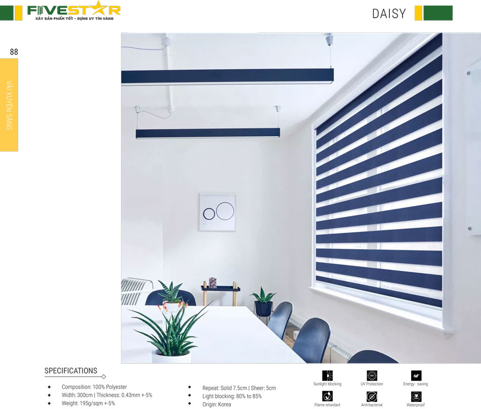 Rèm cầu vồng hãng FIVESTAR được làm từ vải tổng hợp polyester với hai dạng dệt hoàn toàn khác nhau. Trong đó, một lớp vải dày và khít có tác dụng che chắn ánh sáng. Một lớp vải mỏng như lưới giúp tạo ra không gian mở để bạn có thể nhìn xuyên ra bên ngoài. Chất liệu polyester cao cấp có độ bền rất cao, khả năng chống nắng tốt, thân thiện với môi trường và an toàn cho người sử dụng.