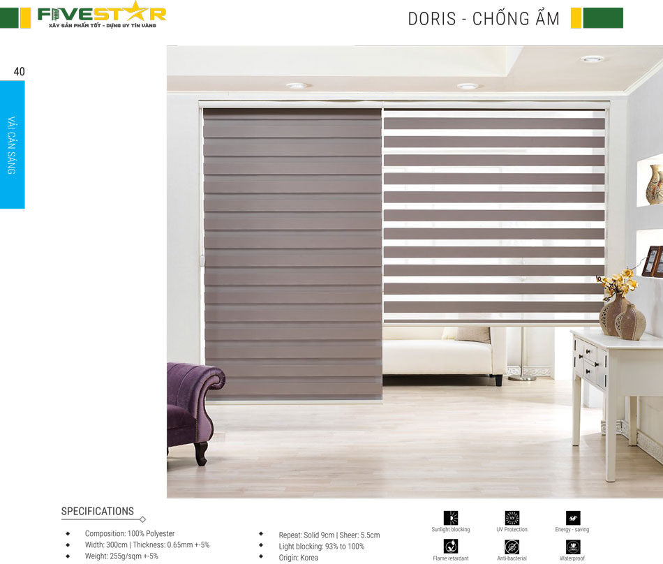 Rèm cầu vồng hãng FIVESTAR được làm từ vải tổng hợp polyester với hai dạng dệt hoàn toàn khác nhau. Trong đó, một lớp vải dày và khít có tác dụng che chắn ánh sáng. Một lớp vải mỏng như lưới giúp tạo ra không gian mở để bạn có thể nhìn xuyên ra bên ngoài. Chất liệu polyester cao cấp có độ bền rất cao, khả năng chống nắng tốt, thân thiện với môi trường và an toàn cho người sử dụng.