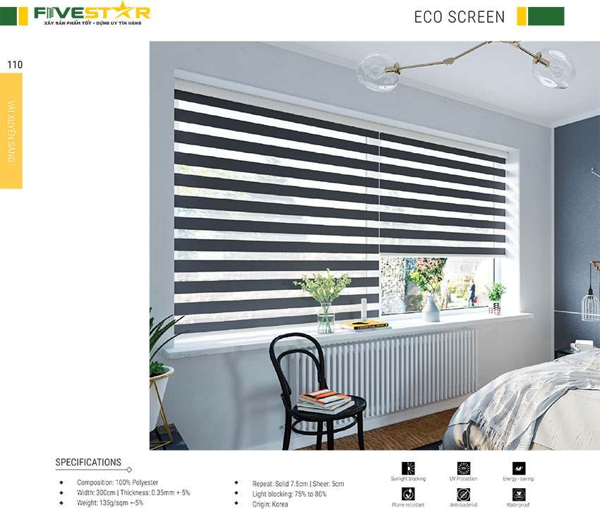 Rèm cầu vồng hãng FIVESTAR được làm từ vải tổng hợp polyester với hai dạng dệt hoàn toàn khác nhau. Trong đó, một lớp vải dày và khít có tác dụng che chắn ánh sáng. Một lớp vải mỏng như lưới giúp tạo ra không gian mở để bạn có thể nhìn xuyên ra bên ngoài. Chất liệu polyester cao cấp có độ bền rất cao, khả năng chống nắng tốt, thân thiện với môi trường và an toàn cho người sử dụng.