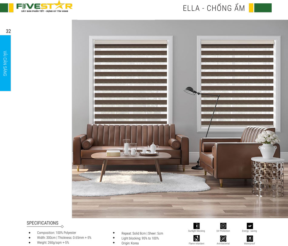 Rèm cầu vồng hãng FIVESTAR được làm từ vải tổng hợp polyester với hai dạng dệt hoàn toàn khác nhau. Trong đó, một lớp vải dày và khít có tác dụng che chắn ánh sáng. Một lớp vải mỏng như lưới giúp tạo ra không gian mở để bạn có thể nhìn xuyên ra bên ngoài. Chất liệu polyester cao cấp có độ bền rất cao, khả năng chống nắng tốt, thân thiện với môi trường và an toàn cho người sử dụng.