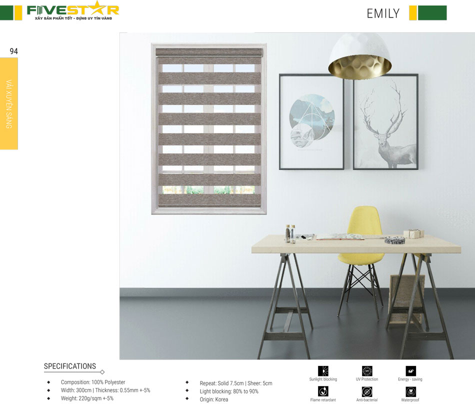 Rèm cầu vồng hãng FIVESTAR được làm từ vải tổng hợp polyester với hai dạng dệt hoàn toàn khác nhau. Trong đó, một lớp vải dày và khít có tác dụng che chắn ánh sáng. Một lớp vải mỏng như lưới giúp tạo ra không gian mở để bạn có thể nhìn xuyên ra bên ngoài. Chất liệu polyester cao cấp có độ bền rất cao, khả năng chống nắng tốt, thân thiện với môi trường và an toàn cho người sử dụng.