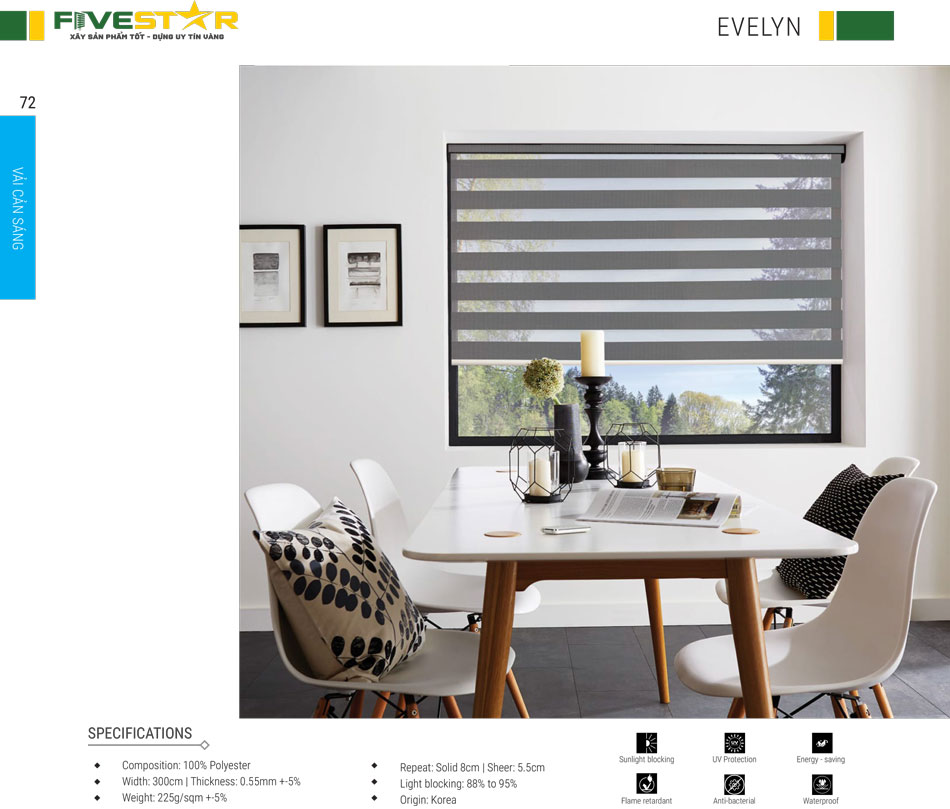 Rèm cầu vồng hãng FIVESTAR được làm từ vải tổng hợp polyester với hai dạng dệt hoàn toàn khác nhau. Trong đó, một lớp vải dày và khít có tác dụng che chắn ánh sáng. Một lớp vải mỏng như lưới giúp tạo ra không gian mở để bạn có thể nhìn xuyên ra bên ngoài. Chất liệu polyester cao cấp có độ bền rất cao, khả năng chống nắng tốt, thân thiện với môi trường và an toàn cho người sử dụng.