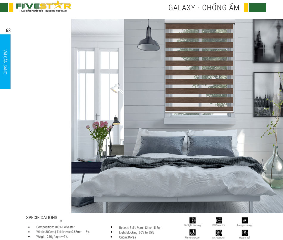 Rèm cầu vồng hãng FIVESTAR được làm từ vải tổng hợp polyester với hai dạng dệt hoàn toàn khác nhau. Trong đó, một lớp vải dày và khít có tác dụng che chắn ánh sáng. Một lớp vải mỏng như lưới giúp tạo ra không gian mở để bạn có thể nhìn xuyên ra bên ngoài. Chất liệu polyester cao cấp có độ bền rất cao, khả năng chống nắng tốt, thân thiện với môi trường và an toàn cho người sử dụng.