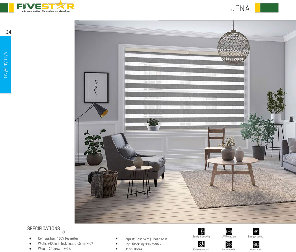 Rèm cầu vồng hãng FIVESTAR được làm từ vải tổng hợp polyester với hai dạng dệt hoàn toàn khác nhau. Trong đó, một lớp vải dày và khít có tác dụng che chắn ánh sáng. Một lớp vải mỏng như lưới giúp tạo ra không gian mở để bạn có thể nhìn xuyên ra bên ngoài. Chất liệu polyester cao cấp có độ bền rất cao, khả năng chống nắng tốt, thân thiện với môi trường và an toàn cho người sử dụng.