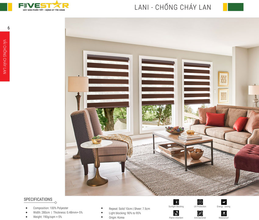 Rèm cầu vồng hãng FIVESTAR được làm từ vải tổng hợp polyester với hai dạng dệt hoàn toàn khác nhau. Trong đó, một lớp vải dày và khít có tác dụng che chắn ánh sáng. Một lớp vải mỏng như lưới giúp tạo ra không gian mở để bạn có thể nhìn xuyên ra bên ngoài. Chất liệu polyester cao cấp có độ bền rất cao, khả năng chống nắng tốt, thân thiện với môi trường và an toàn cho người sử dụng.