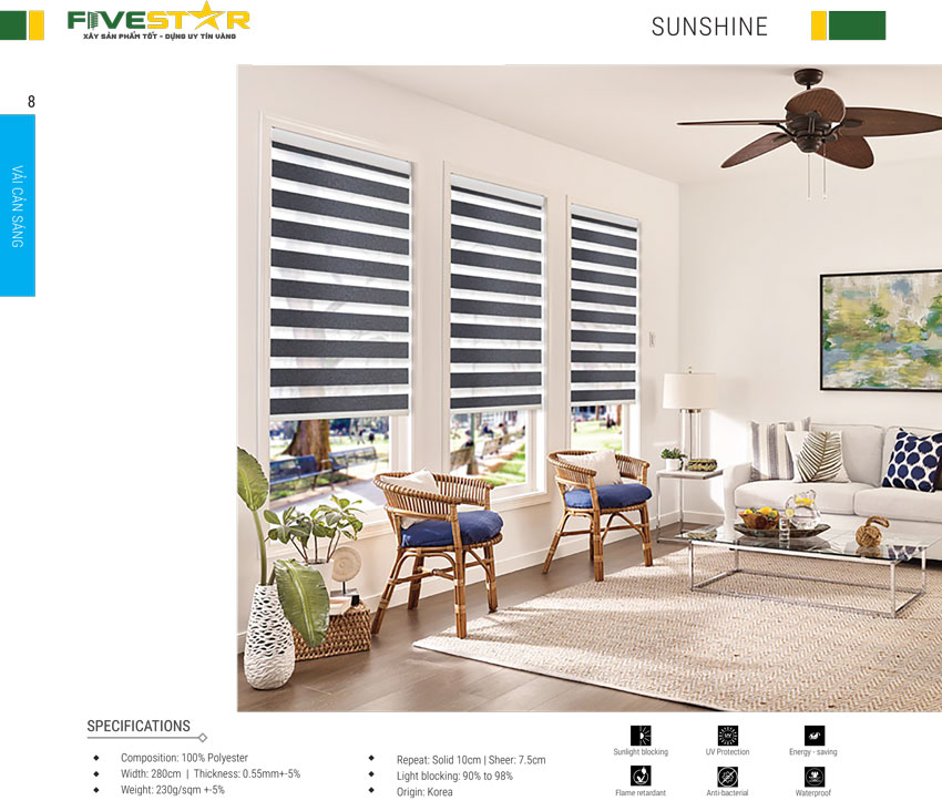 Rèm cầu vồng hãng FIVESTAR được làm từ vải tổng hợp polyester với hai dạng dệt hoàn toàn khác nhau. Trong đó, một lớp vải dày và khít có tác dụng che chắn ánh sáng. Một lớp vải mỏng như lưới giúp tạo ra không gian mở để bạn có thể nhìn xuyên ra bên ngoài. Chất liệu polyester cao cấp có độ bền rất cao, khả năng chống nắng tốt, thân thiện với môi trường và an toàn cho người sử dụng.