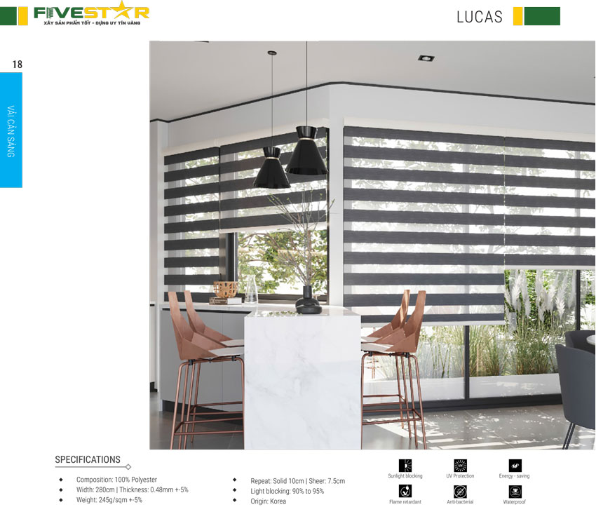 Rèm cầu vồng hãng FIVESTAR được làm từ vải tổng hợp polyester với hai dạng dệt hoàn toàn khác nhau. Trong đó, một lớp vải dày và khít có tác dụng che chắn ánh sáng. Một lớp vải mỏng như lưới giúp tạo ra không gian mở để bạn có thể nhìn xuyên ra bên ngoài. Chất liệu polyester cao cấp có độ bền rất cao, khả năng chống nắng tốt, thân thiện với môi trường và an toàn cho người sử dụng.