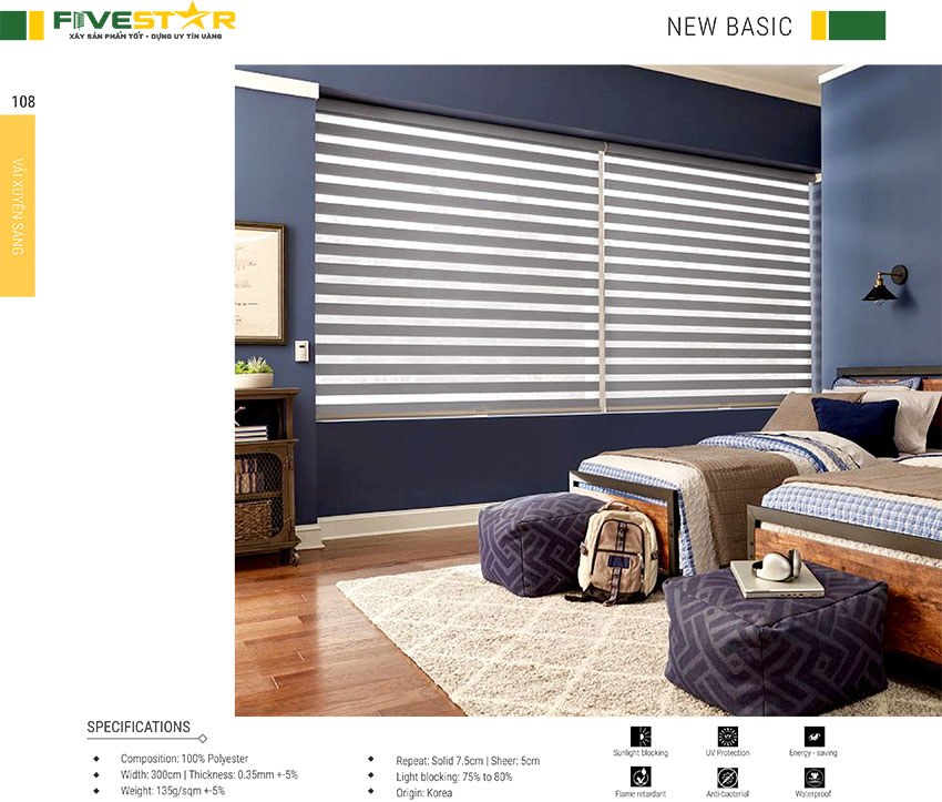 Rèm cầu vồng hãng FIVESTAR được làm từ vải tổng hợp polyester với hai dạng dệt hoàn toàn khác nhau. Trong đó, một lớp vải dày và khít có tác dụng che chắn ánh sáng. Một lớp vải mỏng như lưới giúp tạo ra không gian mở để bạn có thể nhìn xuyên ra bên ngoài. Chất liệu polyester cao cấp có độ bền rất cao, khả năng chống nắng tốt, thân thiện với môi trường và an toàn cho người sử dụng.