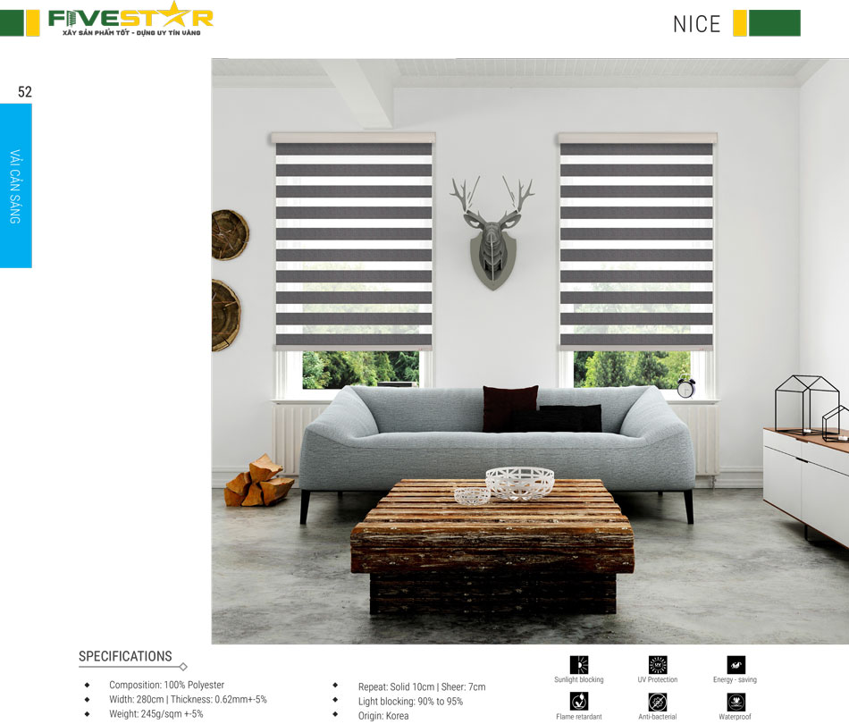 Rèm cầu vồng hãng FIVESTAR được làm từ vải tổng hợp polyester với hai dạng dệt hoàn toàn khác nhau. Trong đó, một lớp vải dày và khít có tác dụng che chắn ánh sáng. Một lớp vải mỏng như lưới giúp tạo ra không gian mở để bạn có thể nhìn xuyên ra bên ngoài. Chất liệu polyester cao cấp có độ bền rất cao, khả năng chống nắng tốt, thân thiện với môi trường và an toàn cho người sử dụng.