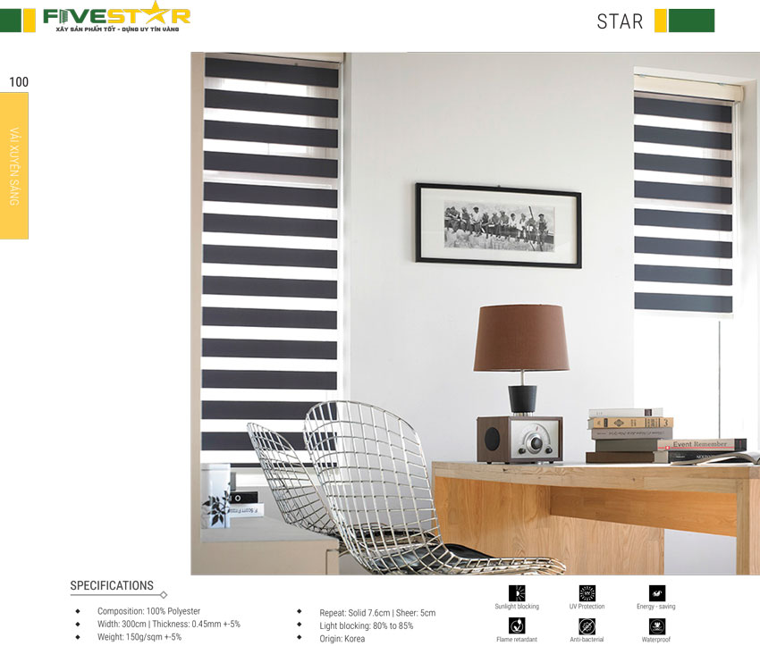 Rèm cầu vồng hãng FIVESTAR được làm từ vải tổng hợp polyester với hai dạng dệt hoàn toàn khác nhau. Trong đó, một lớp vải dày và khít có tác dụng che chắn ánh sáng. Một lớp vải mỏng như lưới giúp tạo ra không gian mở để bạn có thể nhìn xuyên ra bên ngoài. Chất liệu polyester cao cấp có độ bền rất cao, khả năng chống nắng tốt, thân thiện với môi trường và an toàn cho người sử dụng.