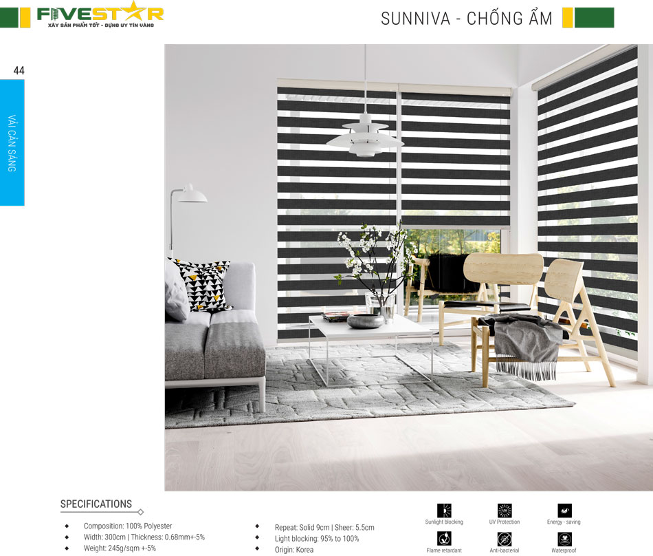 Rèm cầu vồng hãng FIVESTAR được làm từ vải tổng hợp polyester với hai dạng dệt hoàn toàn khác nhau. Trong đó, một lớp vải dày và khít có tác dụng che chắn ánh sáng. Một lớp vải mỏng như lưới giúp tạo ra không gian mở để bạn có thể nhìn xuyên ra bên ngoài. Chất liệu polyester cao cấp có độ bền rất cao, khả năng chống nắng tốt, thân thiện với môi trường và an toàn cho người sử dụng.