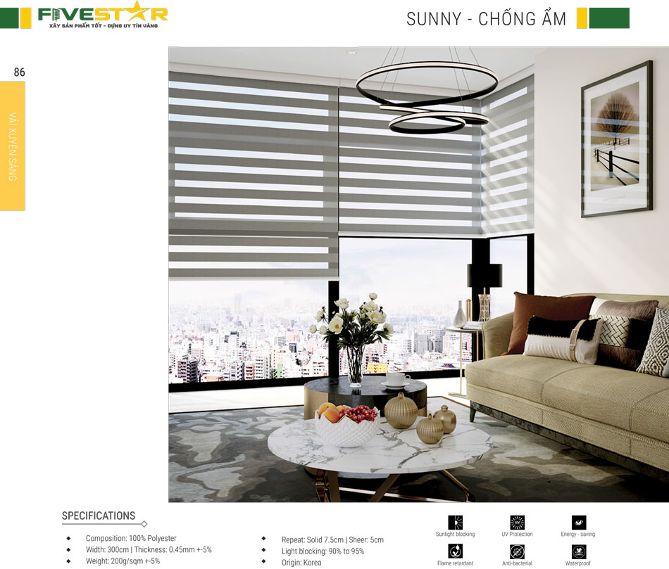 Rèm cầu vồng hãng FIVESTAR được làm từ vải tổng hợp polyester với hai dạng dệt hoàn toàn khác nhau. Trong đó, một lớp vải dày và khít có tác dụng che chắn ánh sáng. Một lớp vải mỏng như lưới giúp tạo ra không gian mở để bạn có thể nhìn xuyên ra bên ngoài. Chất liệu polyester cao cấp có độ bền rất cao, khả năng chống nắng tốt, thân thiện với môi trường và an toàn cho người sử dụng.