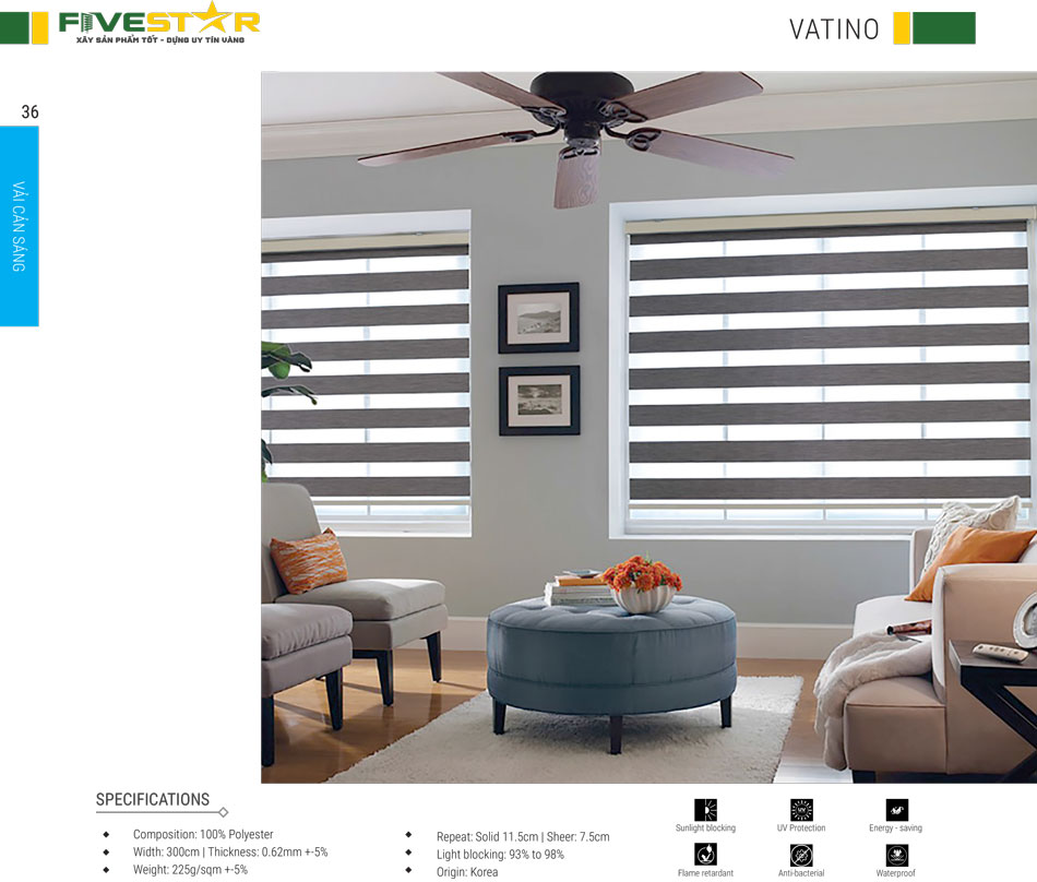 Rèm cầu vồng hãng FIVESTAR được làm từ vải tổng hợp polyester với hai dạng dệt hoàn toàn khác nhau. Trong đó, một lớp vải dày và khít có tác dụng che chắn ánh sáng. Một lớp vải mỏng như lưới giúp tạo ra không gian mở để bạn có thể nhìn xuyên ra bên ngoài. Chất liệu polyester cao cấp có độ bền rất cao, khả năng chống nắng tốt, thân thiện với môi trường và an toàn cho người sử dụng.