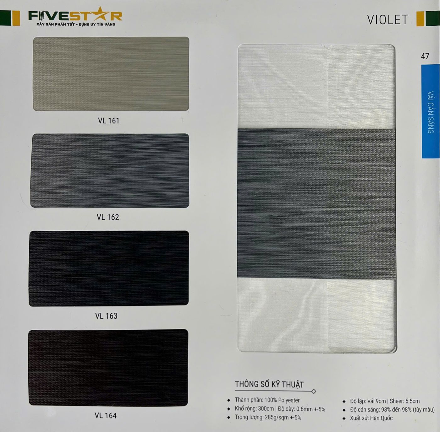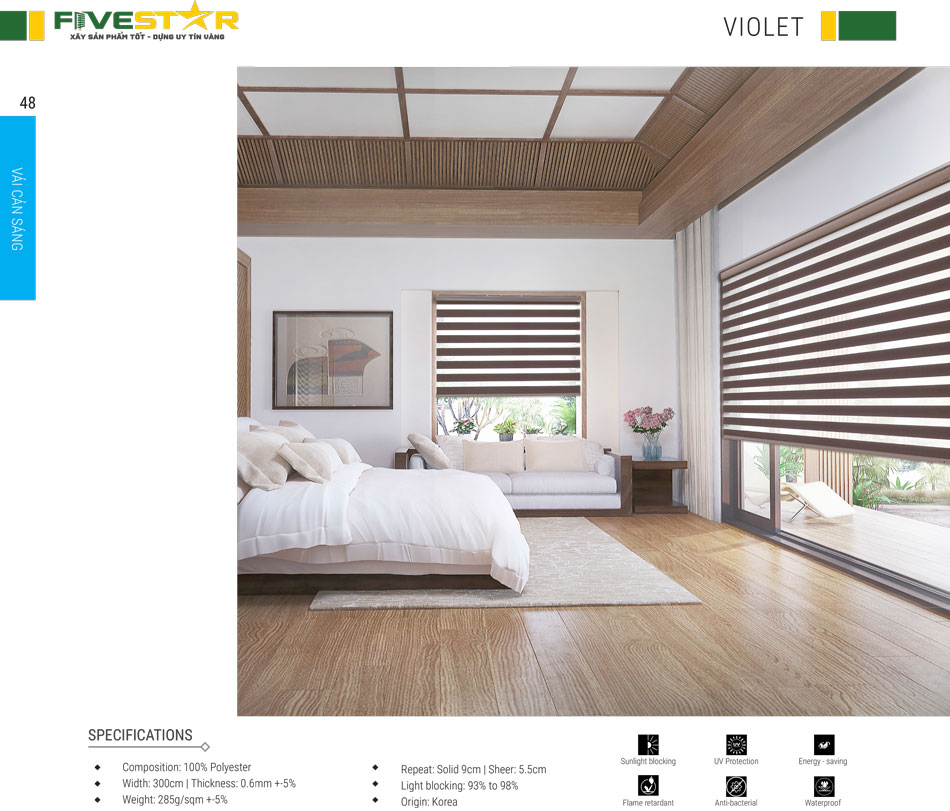 Rèm cầu vồng hãng FIVESTAR được làm từ vải tổng hợp polyester với hai dạng dệt hoàn toàn khác nhau. Trong đó, một lớp vải dày và khít có tác dụng che chắn ánh sáng. Một lớp vải mỏng như lưới giúp tạo ra không gian mở để bạn có thể nhìn xuyên ra bên ngoài. Chất liệu polyester cao cấp có độ bền rất cao, khả năng chống nắng tốt, thân thiện với môi trường và an toàn cho người sử dụng.